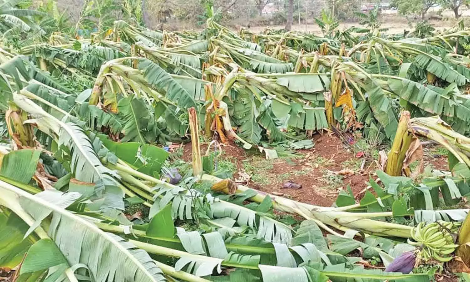 வாழை மரங்கள் முறிந்து கிடப்பதை படத்தில் காணலாம்.