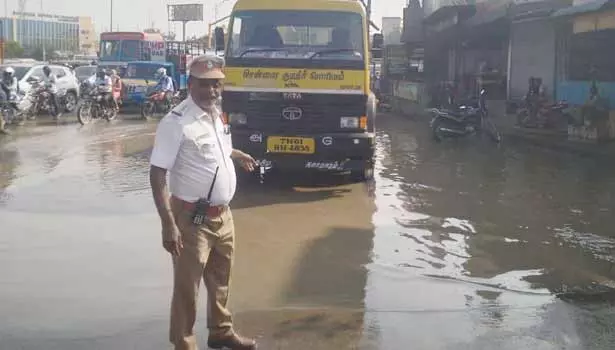 போக்குவரத்து இன்ஸ்பெக்டர் மாரிமுத்து மற்றும் போலீசார் போக்குவரத்தை சரிசெய்தனர். இதுபற்றி அறிந்ததும் குடிநீர் மற்றும் கழிவு நீர் வாரிய அதிகாரிகள் சம்பவ இடத்திற்கு விரைந்து வந்தனர்.