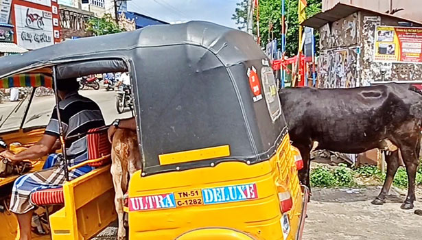 ஆட்டோவை 2 கி.மீ. தொடர்ந்து சென்று கன்றுக்குட்டியிடம் பாசமழை பொழிந்த பசு