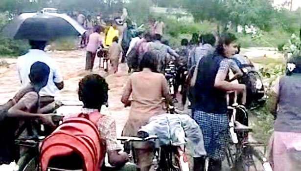 தரைப்பாலத்தில் ஓடும் மழை வெள்ளத்தில் நடந்து செல்லும் பள்ளி மாணவர்கள்