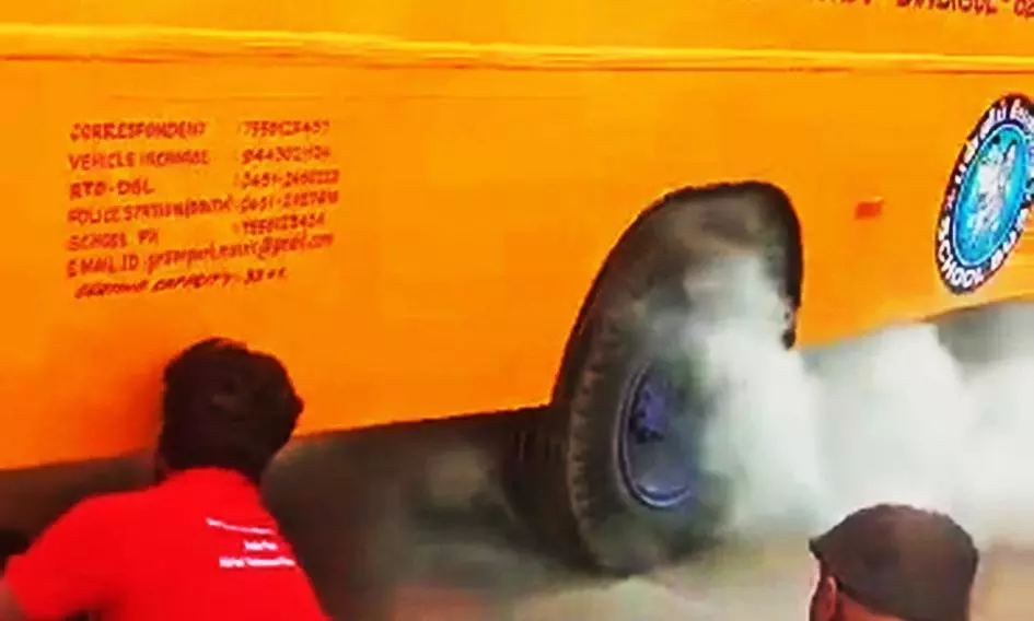 பள்ளி வாகனத்தில் ஏற்பட்ட கரும்புகையை அணைக்கும் பணியில் ஈடுபட்ட ஊழியர்கள்.