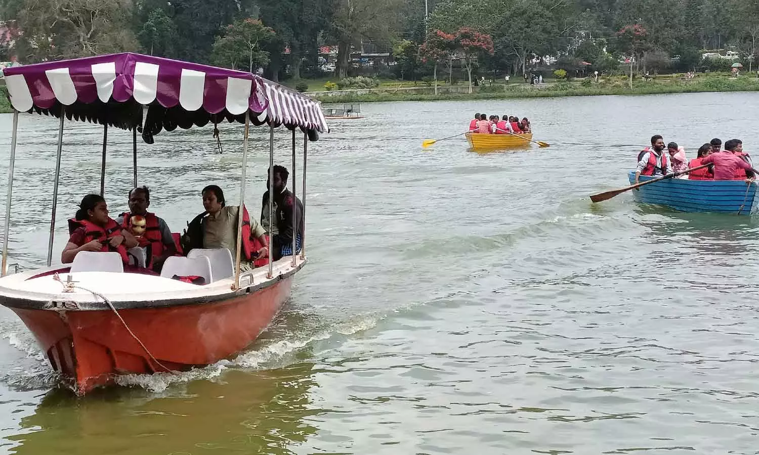 ஏற்காடு ஏரியில் சுற்றுலா பயணிகள் உற்சாகமாக படகு சவாரி செய்த காட்சி.