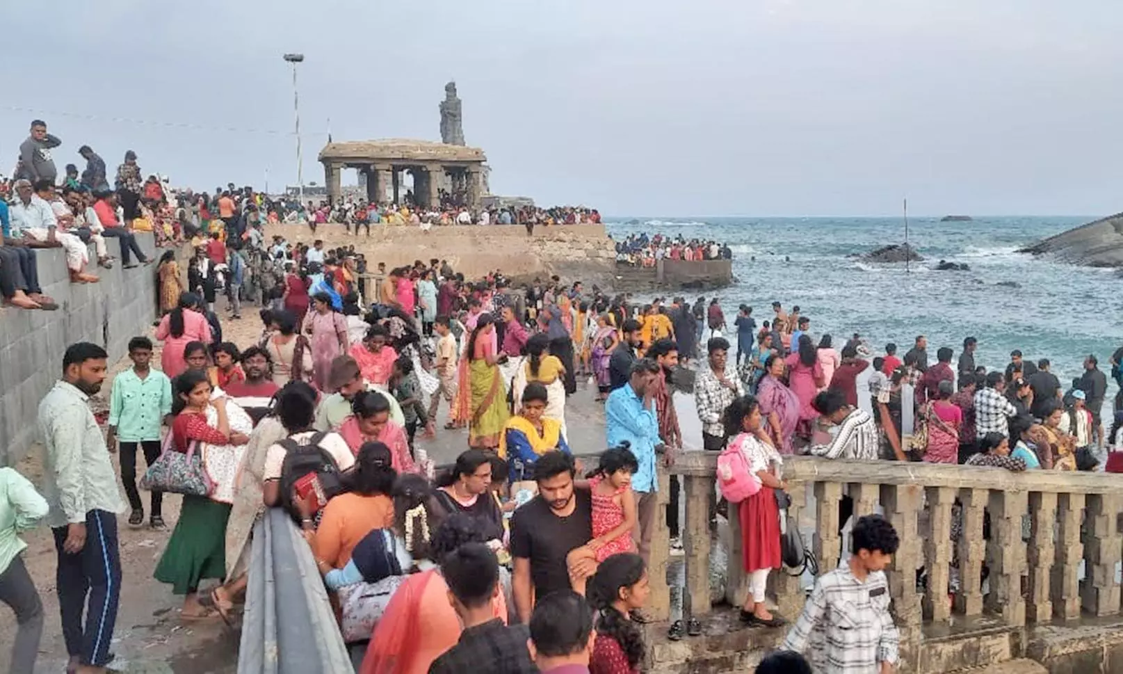 இதேபோல விவேகானந்தபுரத்தில் உள்ள ராமாயண தரிசன சித்திர கண்காட்சிகூடம் மற்றும் சுவாமி விவேகானந்தரின் வாழ்க்கை வரலாற்றை சித்தரிக்கும் புகைப்பட கண்காட்சி கூடம், பாரதமாதா கோவில்ஆகிய இடங்களிலும் சுற்றுலா பயணிகள் கூட்டம் நிரம்பி வழிந்தது. கடல் நடுவில் அமைந்துள்ள விவேகானந்தர் நினைவு மண்டபத்தை பார்வையிட இன்று காலை 6மணியில் இருந்தே சுற்றுலா பயணிகள் படகுத்துறையில் நீண்ட வரிசையில் காத்து இருந்தனர். படகு போக்குவரத்துதொடங்கிய பிறகு அவர்கள் படகில் ஆர்வத்துடன் பயணம் செய்து விவேகானந்தர் மண்டபத்தை பார்வையிட்டு வந்தனர். சுற்றுலா பயணிகள் 2 மணி நேரம்நீண்ட வரிசையில் காத்திருந்து படகில் சென்று விவேகானந்தர் மண்டபத்தை பார்வையிட்டனர். அதேபோல திருவள்ளுவர் சிலையையும், சுற்றுலா பயணிகள் 2 மணிநேரம் காத்திருந்து படகில்சென்று பார்வையிட்டுவந்தனர்.