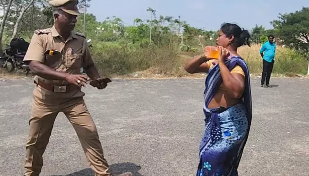 பெட்ரோல் ஊற்றி தீக்குளிக்க முயன்ற பெண்ணை போலீசார் தடுத்து நிறுத்திய காட்சி.