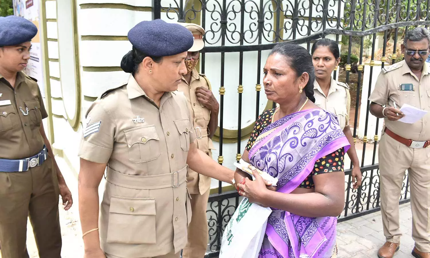 மண்ணெண்ணை கேனை கொண்டு வந்த சாந்தியிடம் போலீசார் விசாரணை நடத்திய காட்சி.