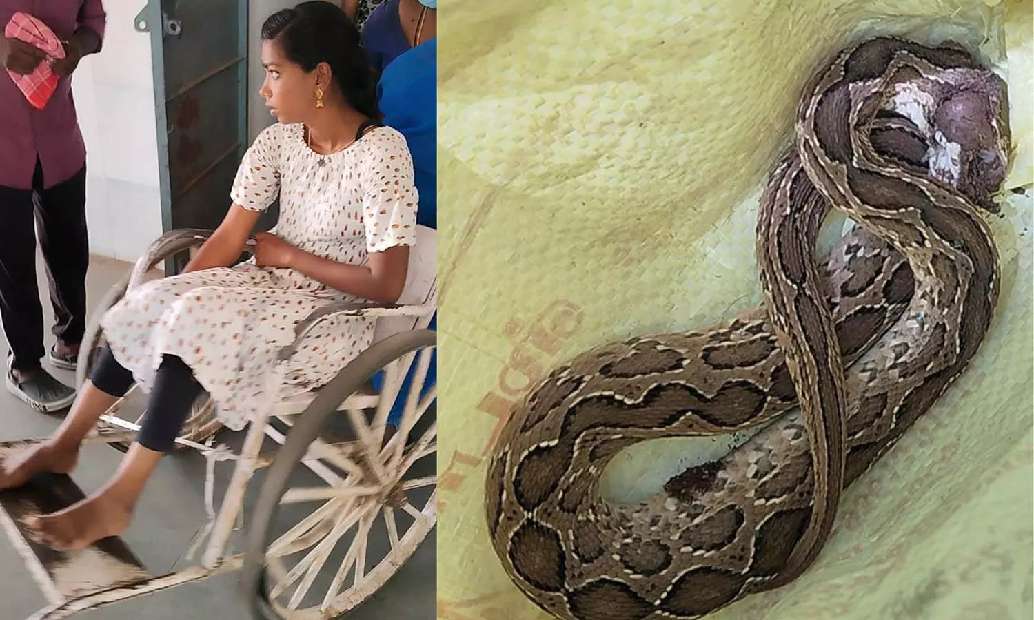 காயமடைந்த மாணவி மற்றும் அவரை கடித்த கட்டுவிரியன் பாம்பு.