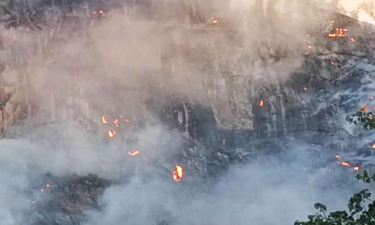 மலைப்பகுதியில் பற்றி எரியும் காட்டுத்தீயை படத்தில் காணலாம்.