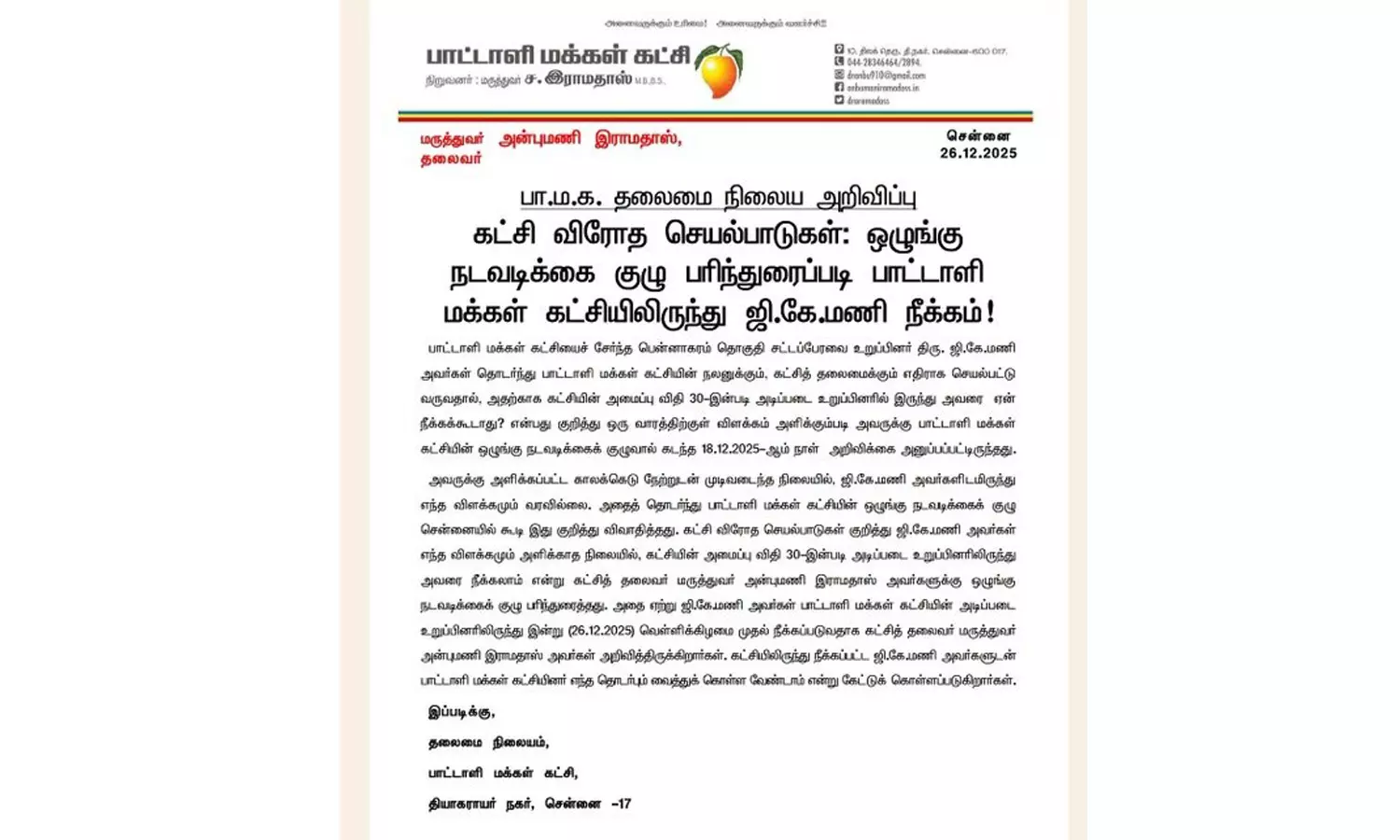 - கால அவகாசம் வழங்கியும் விளக்கமளிக்காததால் ஜி.கே.மணி நீக்கப்பட்டுள்ளார்.