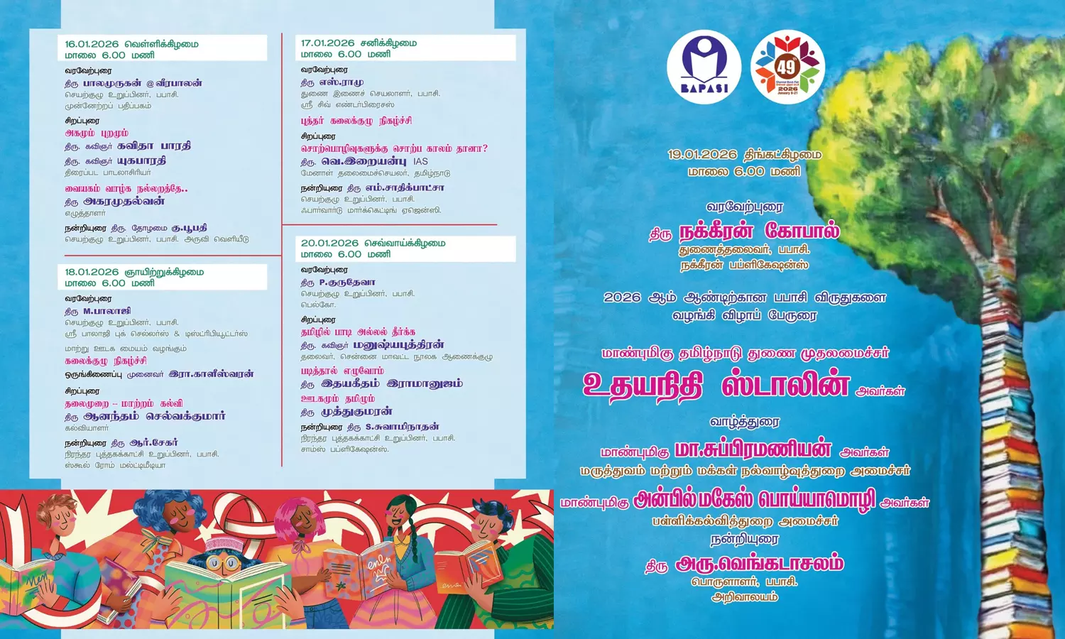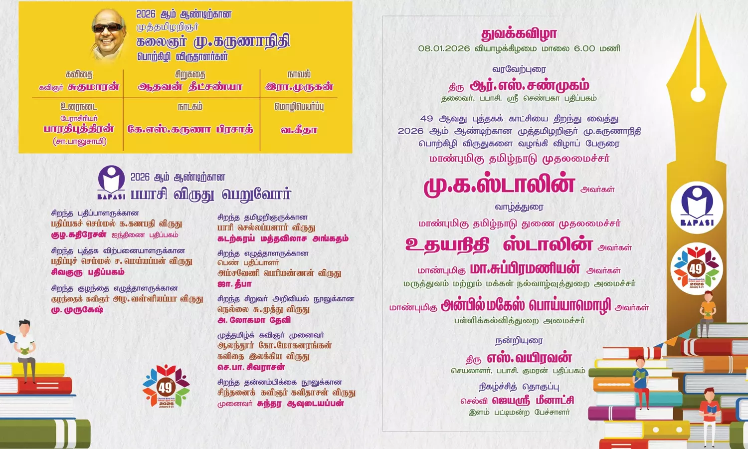 மேலும், 2026-ஆம் ஆண்டு நடைபெறவுள்ள 49-வது சென்னை புத்தகக் கண்காட்சியில் வழங்கப்படவுள்ள முத்தமிழறிஞர் கலைஞர் மு. கருணாநிதி பொற்கிழி விருதுகள் மற்றும் பபாசி (BAPASI) விருதுகளுக்கான வெற்றியாளர்கள் பட்டியலை தென்னிந்திய புத்தக விற்பனையாளர் மற்றும் பதிப்பாளர் சங்கம் சமீபத்தில் அறிவித்துள்ளது.