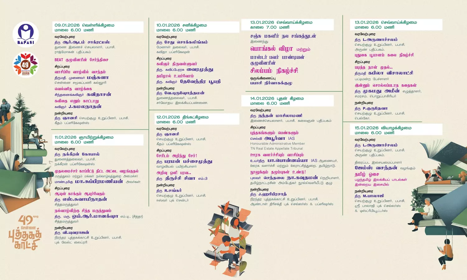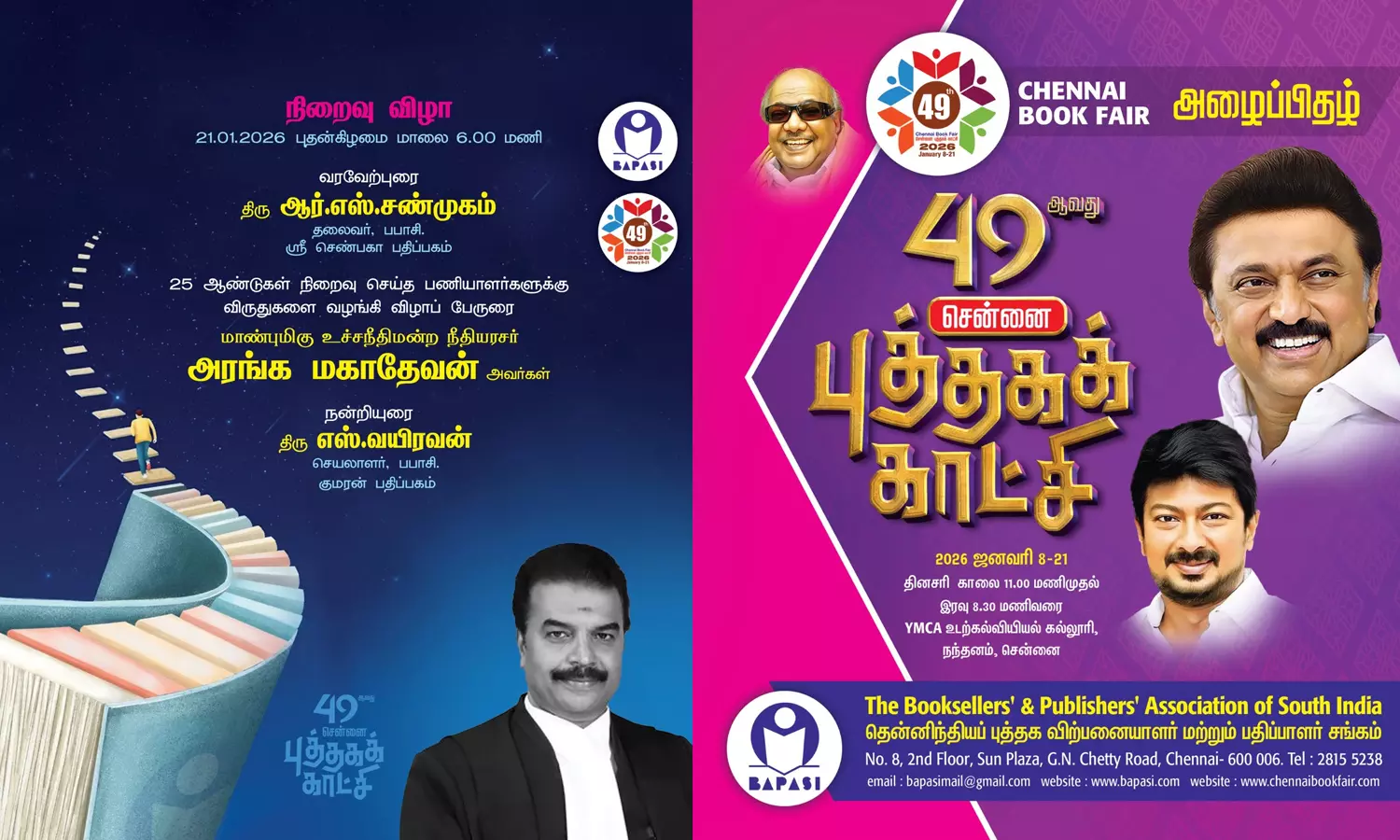 தென்னிந்திய புத்தக விற்பனையாளர் மற்றும் பதிப்பாளர் சங்கம் (BAPASI) நடத்தும் இந்த 49வது புத்தகக் கண்காட்சி, நாளை (ஜனவரி 8) தொடங்கி ஜனவரி 21 வரை நடைபெற உள்ளது.