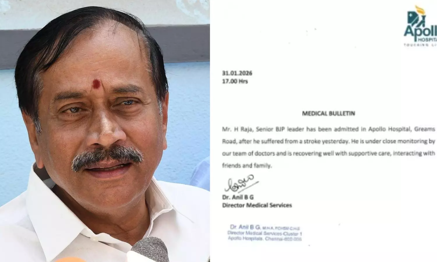 அறிக்கையில், பாஜக மூத்த தலைவர் எச். ராஜாவுக்கு பக்கவாத பாதிப்பு ஏற்பட்டுள்ளது. அவருக்கு தொடர் சிகிச்சை அளிக்கப்பட்டு வருகிறது.