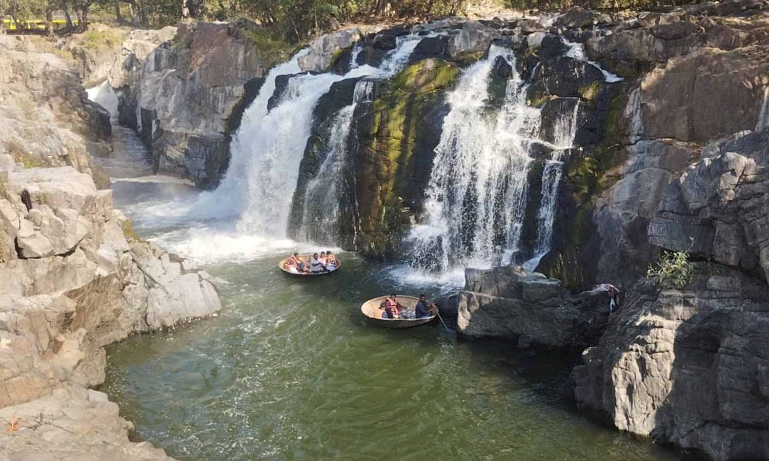 சுற்றுலா பயணிகள் பாதுகாப்பு உடை அணிந்து பாறைகளுக்கு இடையே காவிரி ஆற்றில் உற்சாகமாக பரிசல் சவாரி மேற்கொண்டு காவிரி ஆற்றின் அழகை ரசித்தனர்.