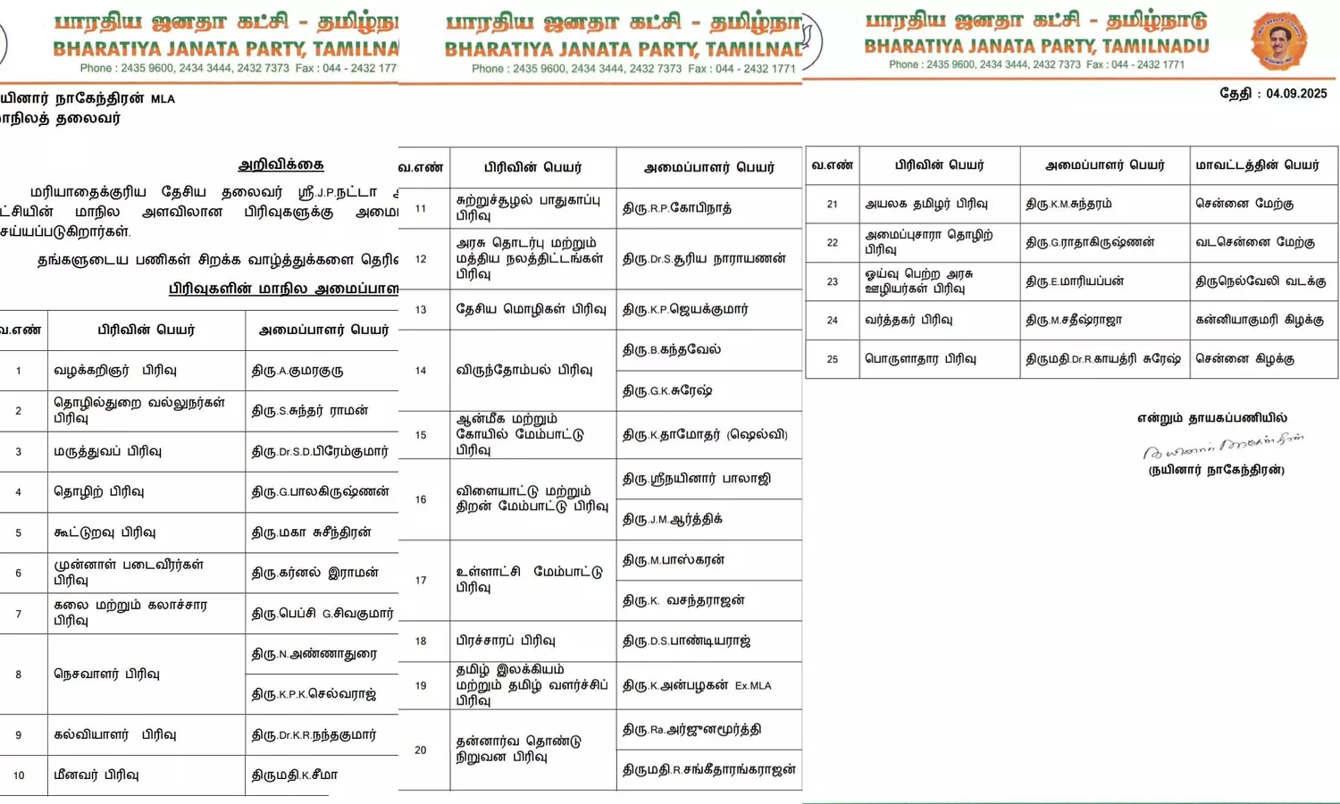 மேலும் கட்சியில் உள்ள 25 அணிகளுக்கு அமைப்பாளர்களை நியமித்து மாநில தலைவர் நயினார் நாகேந்திரன் உத்தரவு.