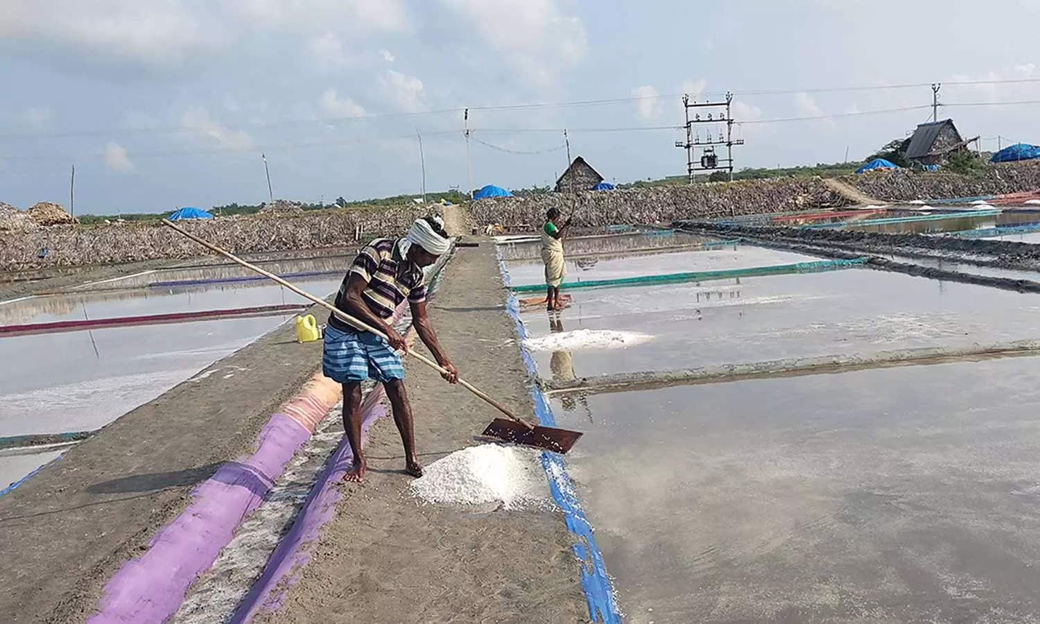- உப்பள பாத்திகளில் இருந்து உப்புவாரும் பணியில் தொழிலாளர்கள் ஈடுபட்டு வருகின்றனர்.