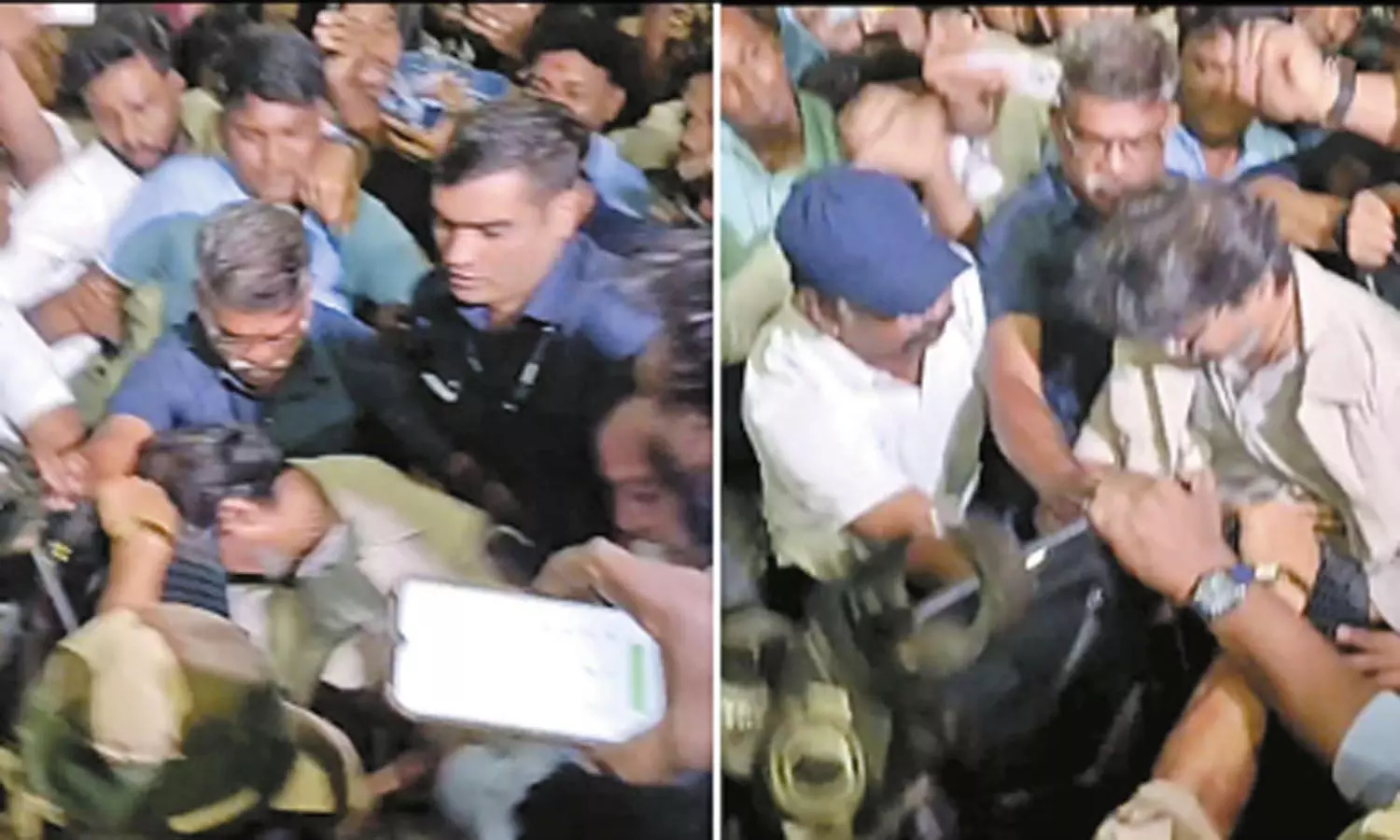 விமான நிலையத்தில் விஜய்யை பார்ப்பதற்காக ரசிகர்கள், த.வெ.க. நிர்வாகிகள், தொண்டர்கள் குவிந்திருந்தனர். விமான நிலையத்தில் இருந்து வெளியே வந்த விஜய்யை பார்ப்பதற்காக தாக ரசிகர்கள் முண்டியடித்ததால் தள்ளுமுள்ளு ஏற்பட்டது. இதனால் காருக்குள் ஏறச்சென்ற விஜய், நிலை தடுமாறி கீழே விழுந்துவிட்டார்.