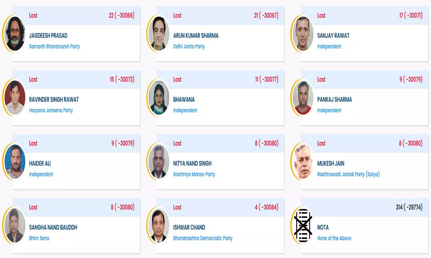 இந்த நிலையில் ஆறு வேட்பாளர்கள் ஒற்றையிலக்க வாக்குகளை மட்டுமே பெற்றுள்ளனர். அதிலும் ஈஸ்வர் சந்த் என்ற வேட்பாளர் பாரத்ராஸ்ட்ரா ஜனநாயக கட்சி சார்பில் போட்டியிட்டார். இவர் வெறும் 4 வாக்குகள் மடடுமே பெற்றுள்ளார்.