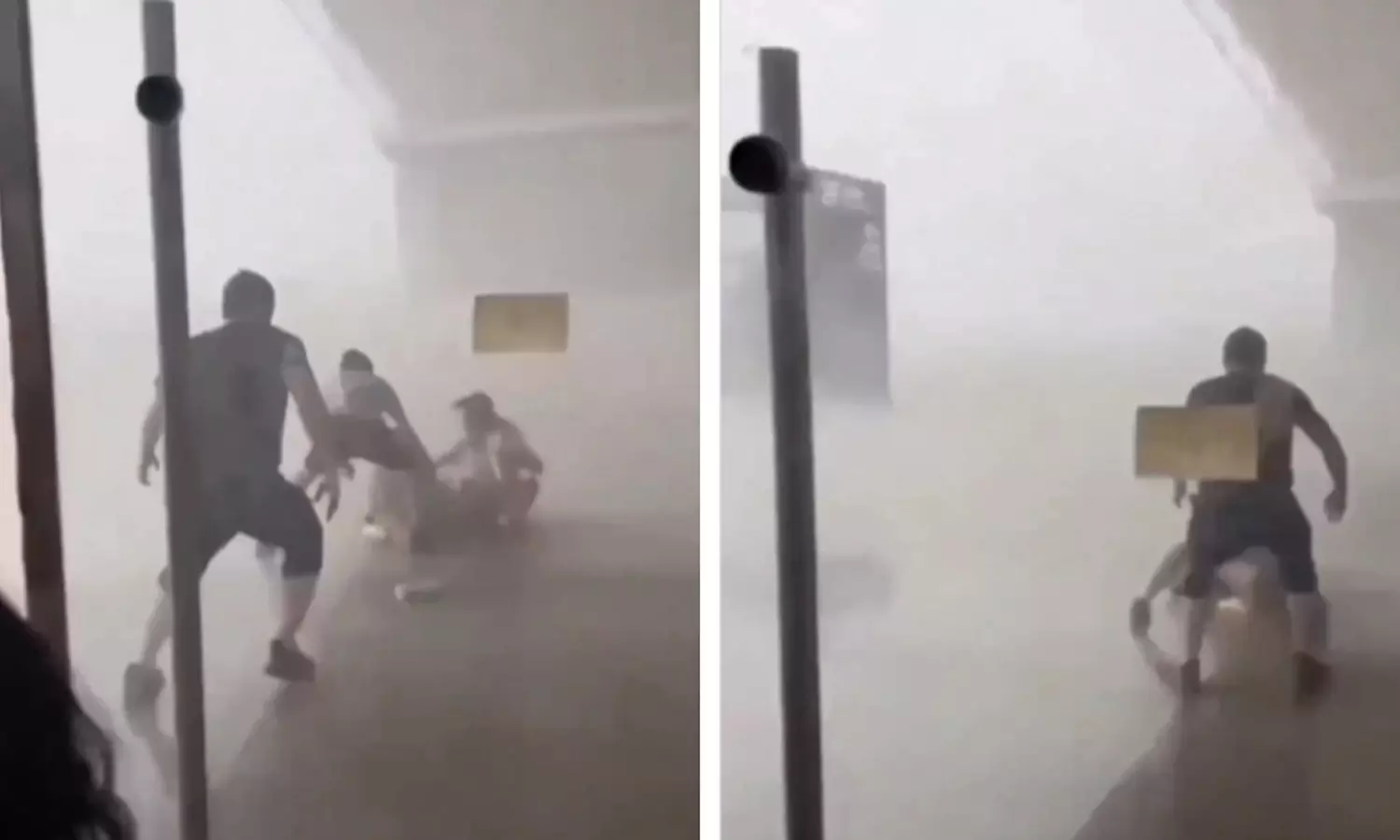 தென்கிழக்கு நாடு ஒன்றில் எடுக்கப்பட்ட அந்த வீடியோவில் கனமழையுடன் கூடிய கடுமையான புயல் ஒன்று சுழன்று அடிக்கிறது. புயலில் இருந்து தப்பிப் பிழைக்க அங்கே உள்ள கடை ஒன்றில் பாதுகாப்புக்காக சிலர் ஒதுங்கி நிற்கிறார்கள்.