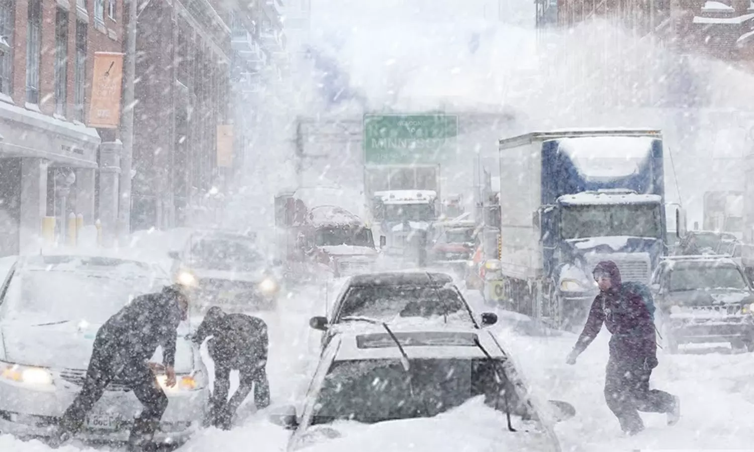 - சாலைகள், வீதிகளெங்கும் பனித்துகள்கள் பல அடி உயரத்துக்கு குவிந்து கிடக்கின்றன.