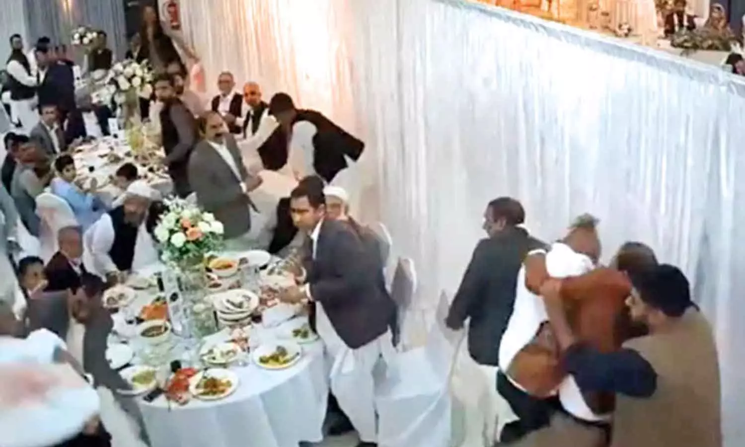 பாகிஸ்தானில் நடைபெற்ற திருமண விருந்து நிகழ்ச்சியில் உறவினர்கள் இடையே மோதல் ஏற்பட்டு ஒருவர் மீது ஒருவர் நாற்காலிகளை வீசி சண்டை போட்ட வீடியோ டுவிட்டரில் வைரலாகி வருகிறது.