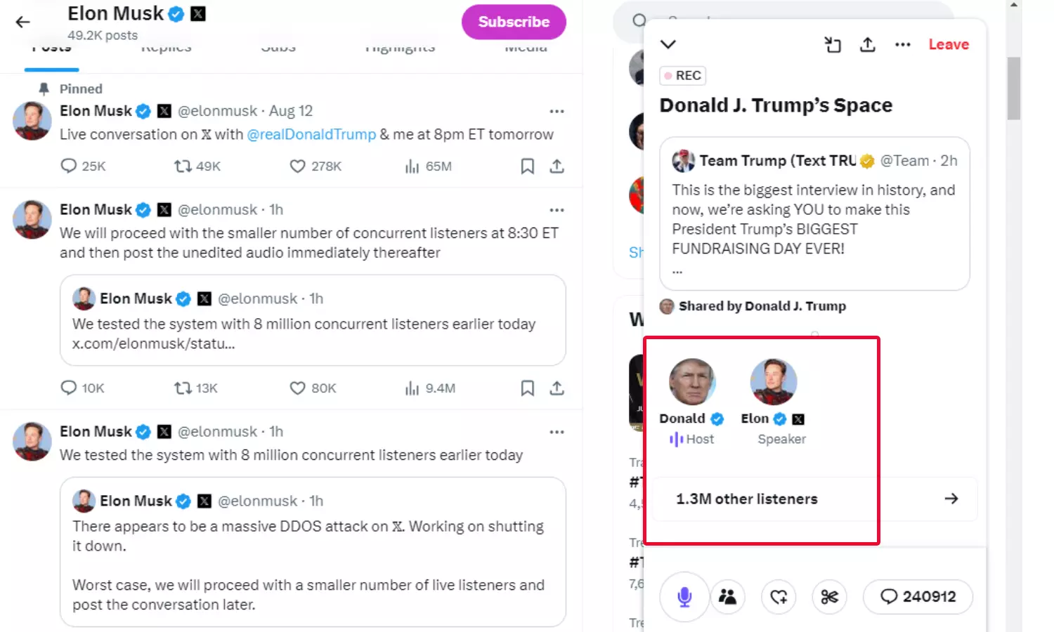 உலகின் முன்னணி பணக்காரர்களில் ஒருவரும், எக்ஸ் தளத்தின் உரிமையாளருமான எலான் மஸ்க் அமெரிக்க அதிபர் தேர்தலில் களம் காணும் டொனால்டு டிரம்ப்-ஐ நேர்காணல் செய்தார். இந்த நேர்காணல் எக்ஸ் தளத்தின் ஸ்பேசஸில் நடைபெற்றது. உலகம் முழுவதிலும் நேரலையில் நடைபெற்ற இந்த நேர்காணலை சுமார் 13 லட்சம் பேர் கேட்டனர்.