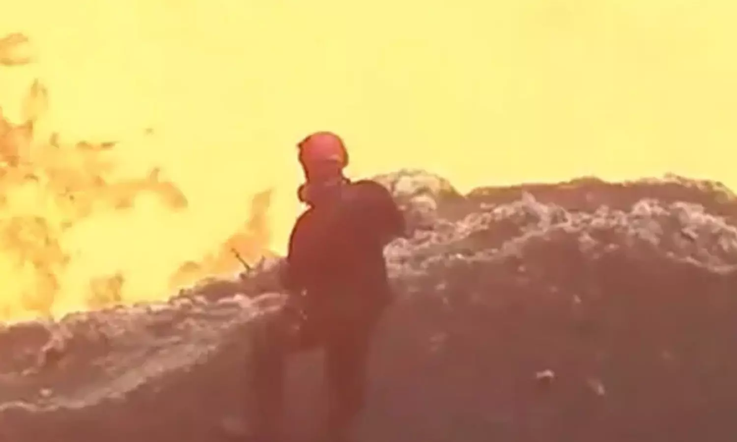 அவருக்கு அருகில் எரிமலை குழம்பு தீப் பிழம்புடன் வந்து விழுகின்றது. தலையில் ஹெல்மட் அணிந்திருக்கும் அவர் கையில் வாக்கி-டாக்கியை வைத்திருக்கிறார். இதன் மூலம் அவர் ஆய்வாளராகவோ அல்லது எரிமலை குறித்து ஆய்வு செய்பவராகவோ இருக்கலாம் என்று தகவல்கள் தெரிவித்துள்ளன.