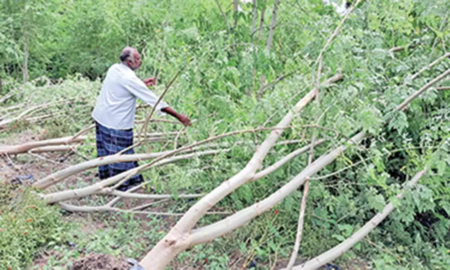 வேரோடு சாய்து கிடக்கும் முருங்கை மரங்கள்.