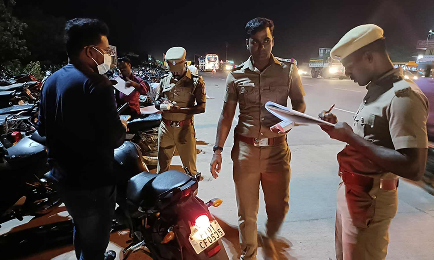 ஆரோவில் சப்-இன்ஸ்பெக்டர் சத்யானந்தன் தலைமையில் போலீசார் வாகன சோதனையில் ஈடுபட்ட காட்சி.