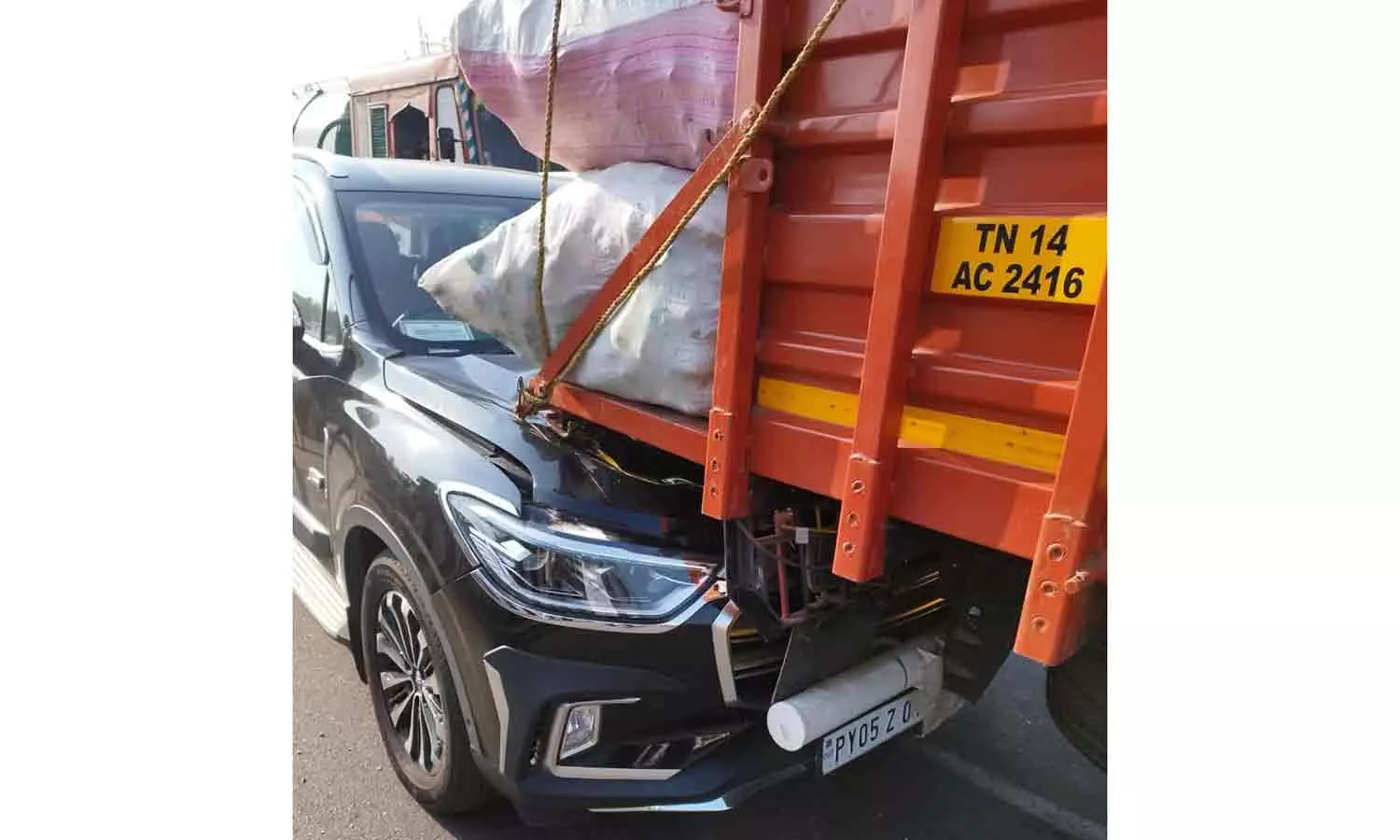 இதில் நின்று கொண்டிருந்த கார், அதற்கு முன்னால் நின்றிருந்த மற்றொரு லாரியின் பின்புறம் மோதியது. இதில் காரின் முன்பக்கம் முழுவதும் முன்னால் நின்ற லாரியின் அடிப்பாகத்தில் சிக்கி பலத்த சேதமடைந்தது.