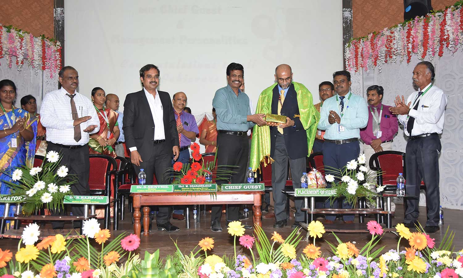 சிறப்பு விருந்தினருக்கு கல்லூரி மேலாண் இயக்குனர் தனசேகரன் மலர் செண்டு கொடுத்து வரேவற்ற காட்சி.