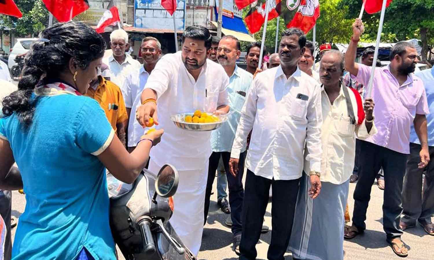பட்டாசு வெடித்து இனிப்பு வழங்கிய காட்சி.