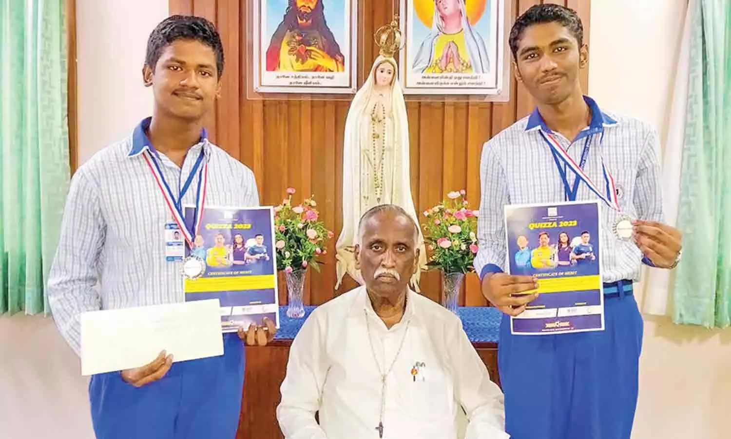 தகுதி தேர்வாக நடந்த இத்தேர்வில் 6 இணை யர்கள் இறுதி போட்டிக்கு தகுதி பெற்றனர். இவர் களில், 3 இணையர்கள் அமலோற்பவம் லுார்து அகாடமி மாண வர்கள் என்பது குறிப்பிடத்தக்கது. 6 இணையர்கள் பங்கு கொண்ட இறுதிப் போட்டி விறுவிறுப்பாக நடந்த 6 சுற்றுகளிலும் பதிலளித்து அமலோற்பவம் லுார்து அகாடமி, பிளஸ்1 மாணவர்கள் பூவராகவன், நவீனபிரியன் 2-ம் இடம் பிடித்து சாதனை படைத்தனர்.