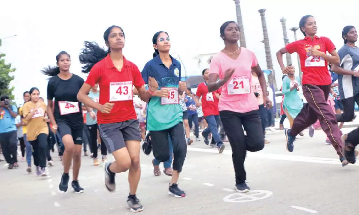 மாரத்தான் போட்டியில் கலந்துகொண்டு ஓடிய கல்லூரி மாணவிகள்.