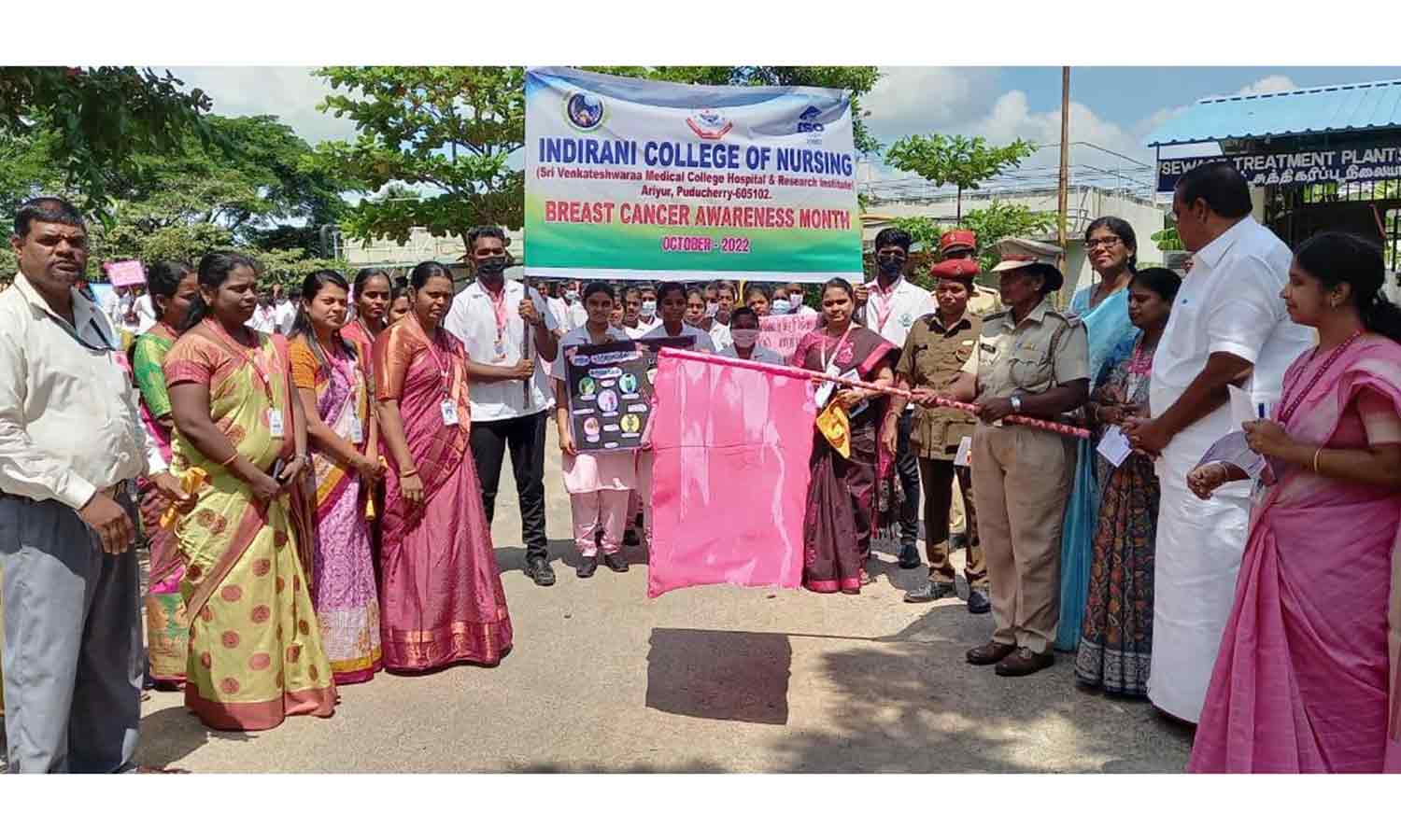 - வெங்கடேஸ்வரா மருத்துவக்கல்லூரி மருத்துவமனைக்கு உட்பட்ட இந்திராணி செவிலியர் கல்லூரி சார்பில் உலக பெண்கள் மார்பக புற்றுநோய் தின விழிப்புணர்வு பேரணி நடைபெற்றது.