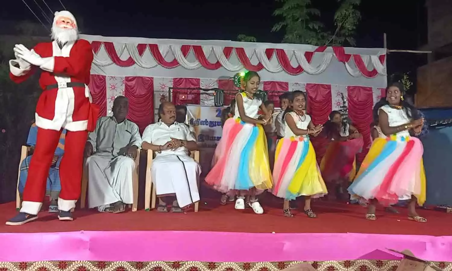 - கிறிஸ்துமஸ் தாத்தா வேடமணிந்த குழந்தைகளுக்கும் கலை நிகழ்ச்சியில் பங்கேற்ற மாணவ-மாணவிகளுக்கும் பரிசு-இனிப்புகள் வழங்கினார்.