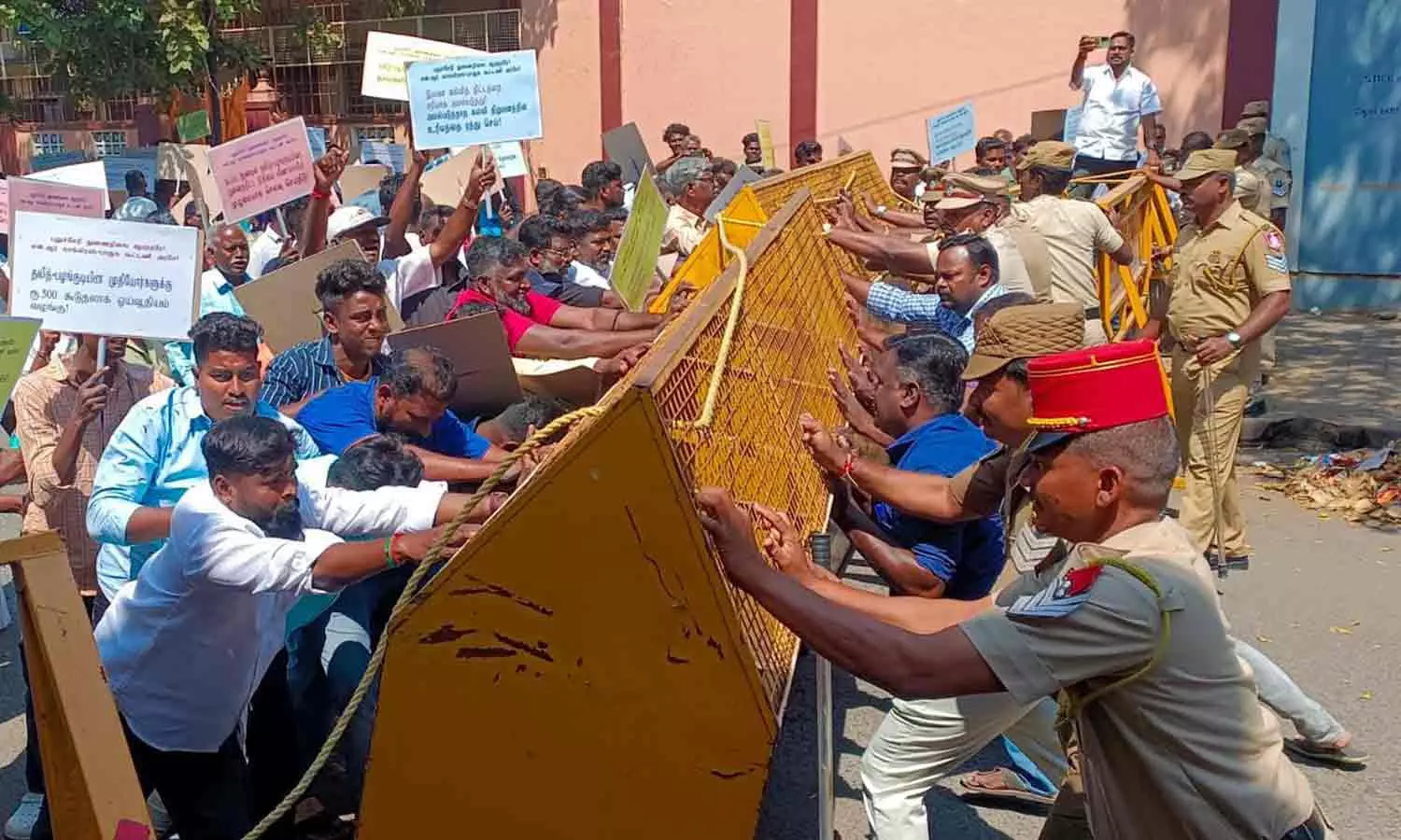 ஆர்ப்பாட்டக்காரர்களுக்கும், போலீசாருக்கும் தள்ளுமுள்ளு ஏற்பட்ட காட்சி.