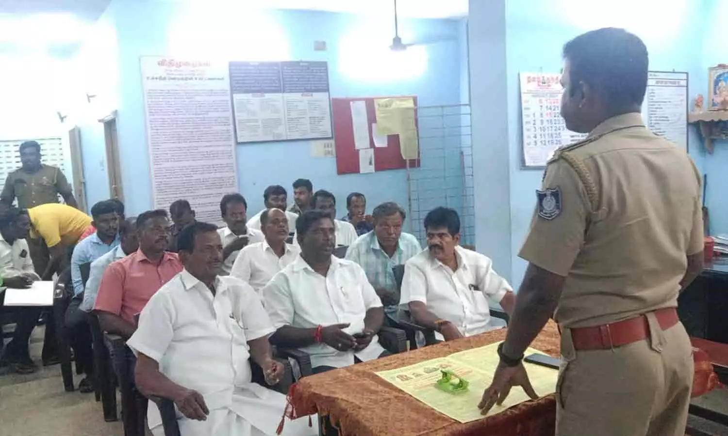 கிருமாம்பாக்கம் போலீஸ் நிலையத்தில் கன்னியகோவில் தீமிதி திருவிழாவையொட்டி 5 கிராம முக்கியஸ்தர்களுடன் ஆலோசனை கூட்டம் நடந்த காட்சி.