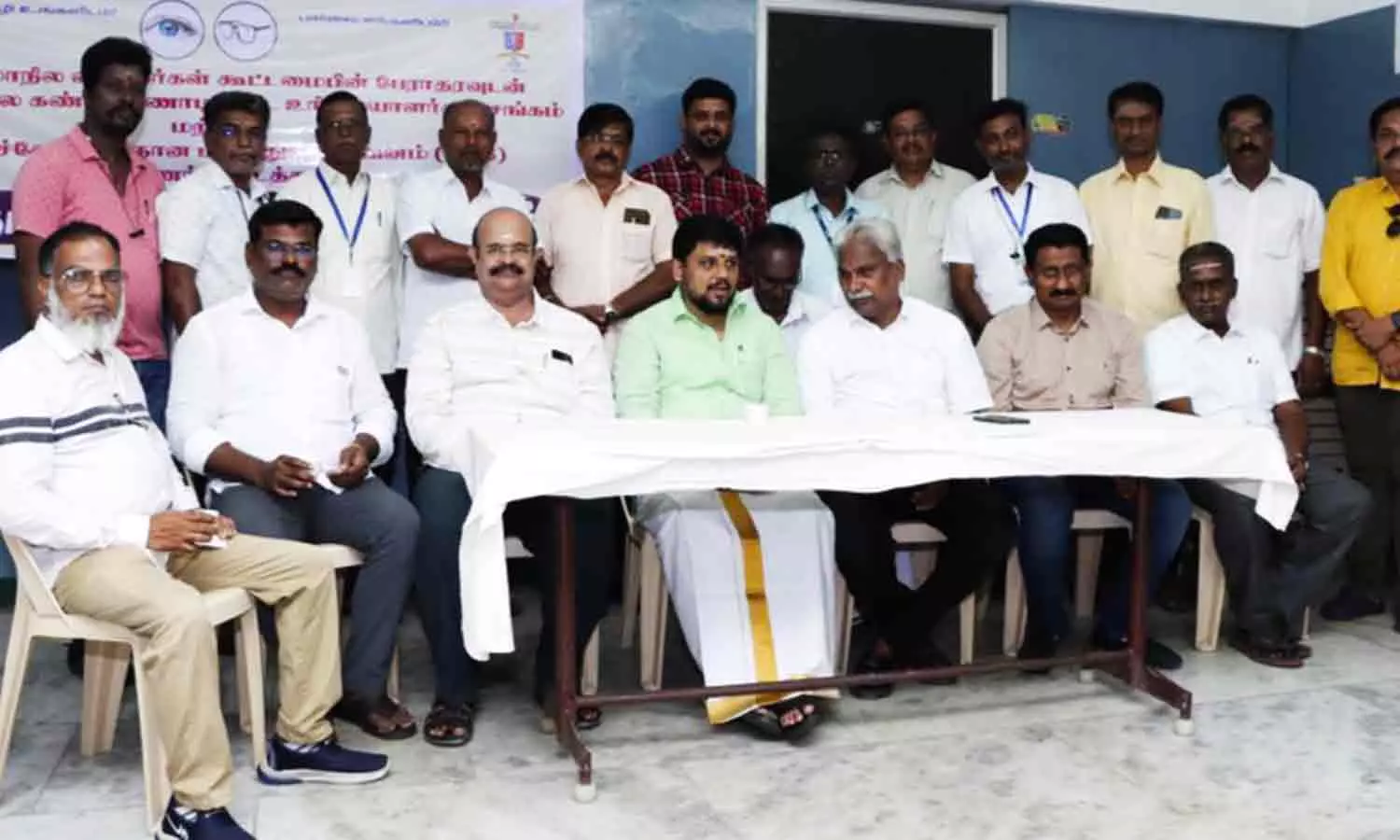 இலவச கண் மருத்துவ பரிசோதனை முகாமை எம்.எல்.ஏ.க்கள் பிரகாஷ்குமார், சிவசங்கர் வணிகர் கூட்டமைப்பு தலைவர் பாபு தொடங்கி வைத்த காட்சி.