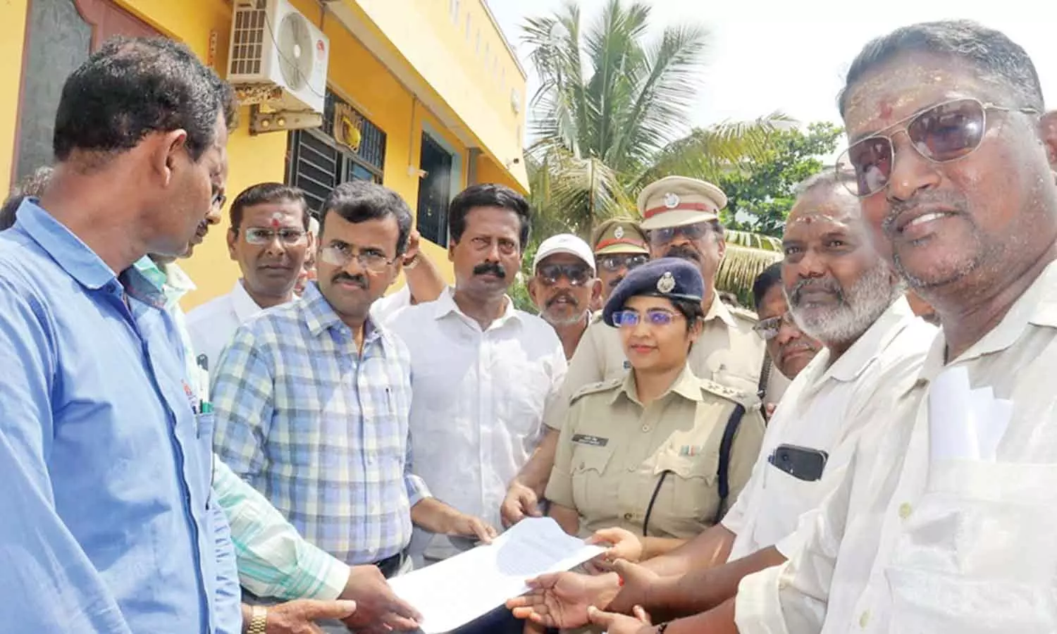 போலீ ஆவணம் தயாரித்து அபகரித்த காமாட்சி அம்மன் கோவில் நிலத்தை கோவில் நிர்வாகிகளிடம் ஒப்படைத்த காட்சி.