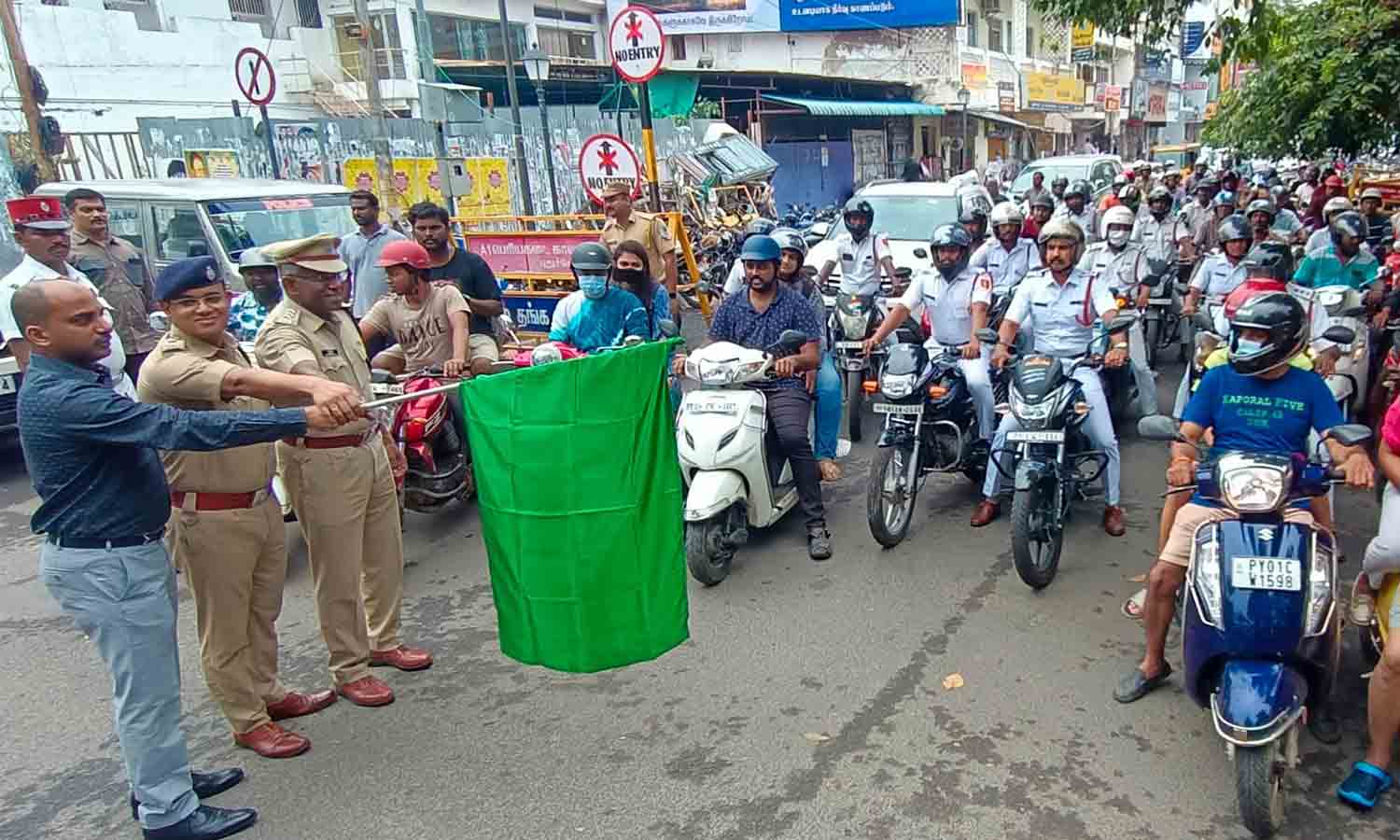 ஹெல்மெட் விழிப்புணர்வு ஊர்வலத்தை சீனியர் போலீஸ் சூப்பிரண்டு நாரா. சைதன்யா தொடங்கி வைத்த காட்சி.