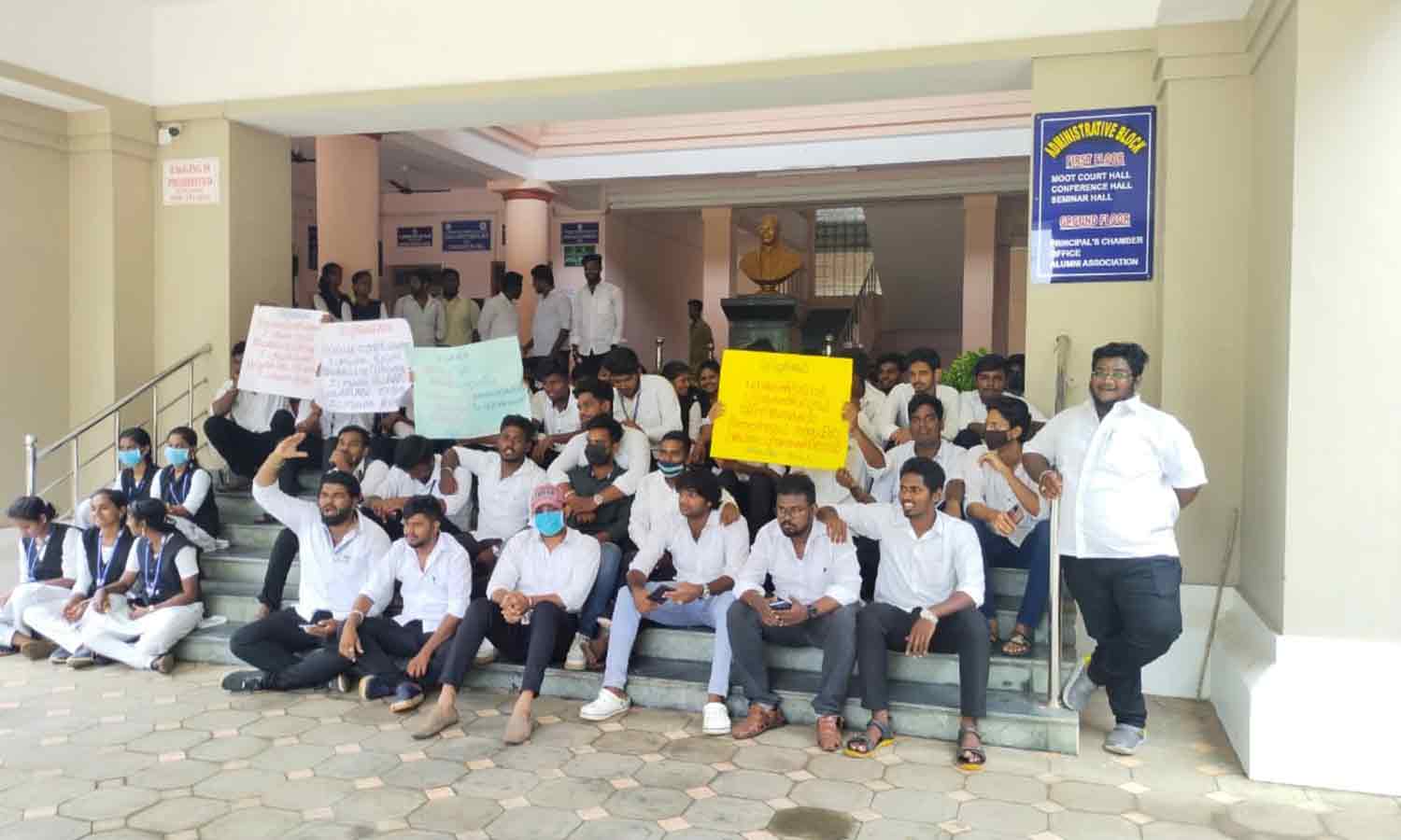 சட்டக்கல்லூரி மாணவர்கள் வகுப்பு புறக்கணித்து போராட்டத்தில் ஈடுபட்ட காட்சி.