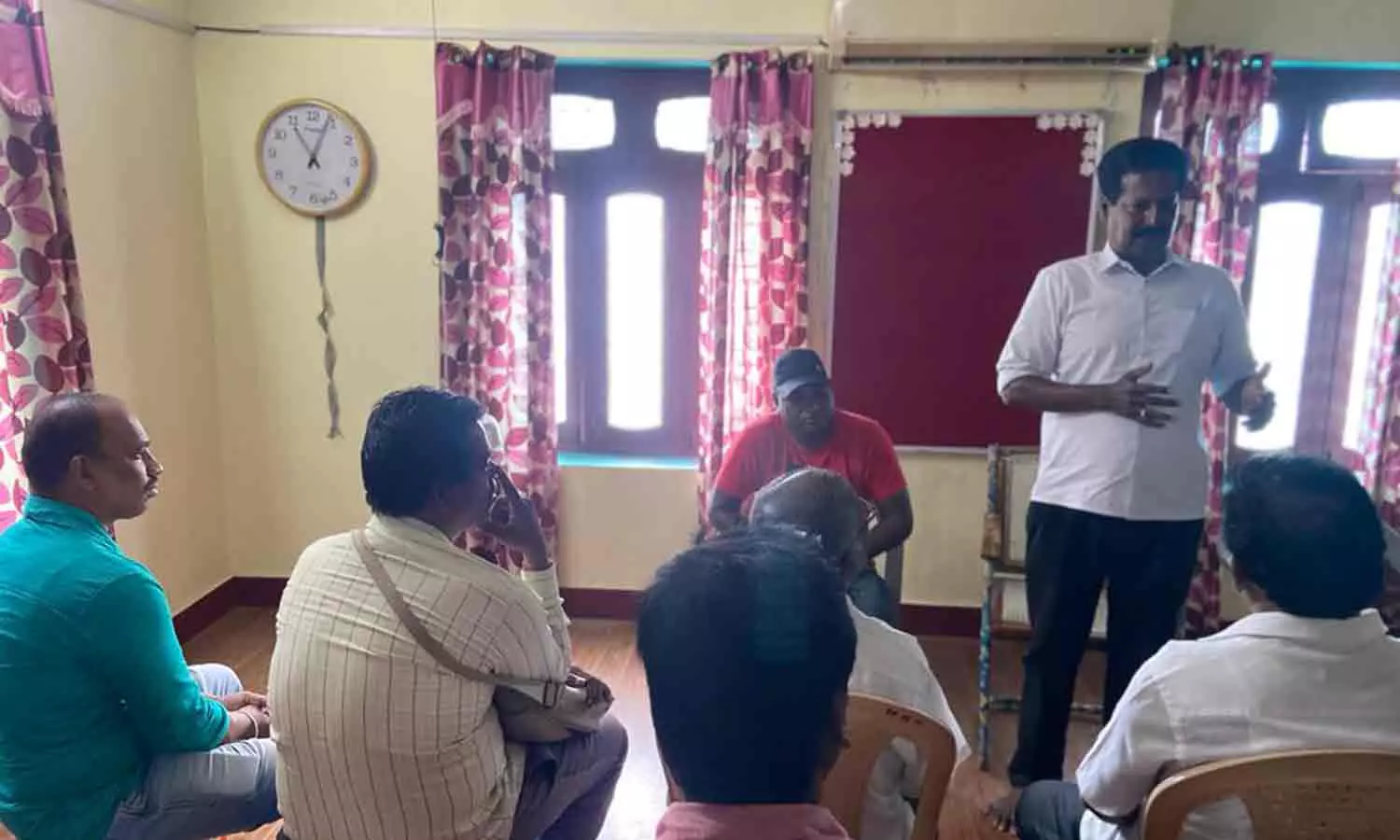 கூட்டத்தில் விளையாட்டு வீரர்கள் நலச்சங்க தலைவர் வளவன் பேசிய போது எடுத்த படம்.