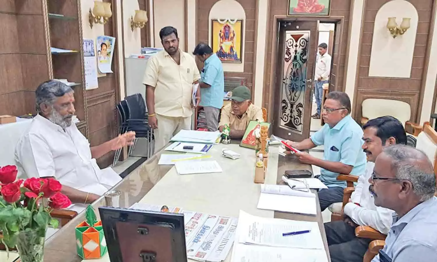 கொம்யூன் பஞ்சாயத்து அதிகாரிகளுடன் அமைச்சர் தேனீ.ஜெயக்குமார் ஆலோசனை நடத்திய காட்சி.