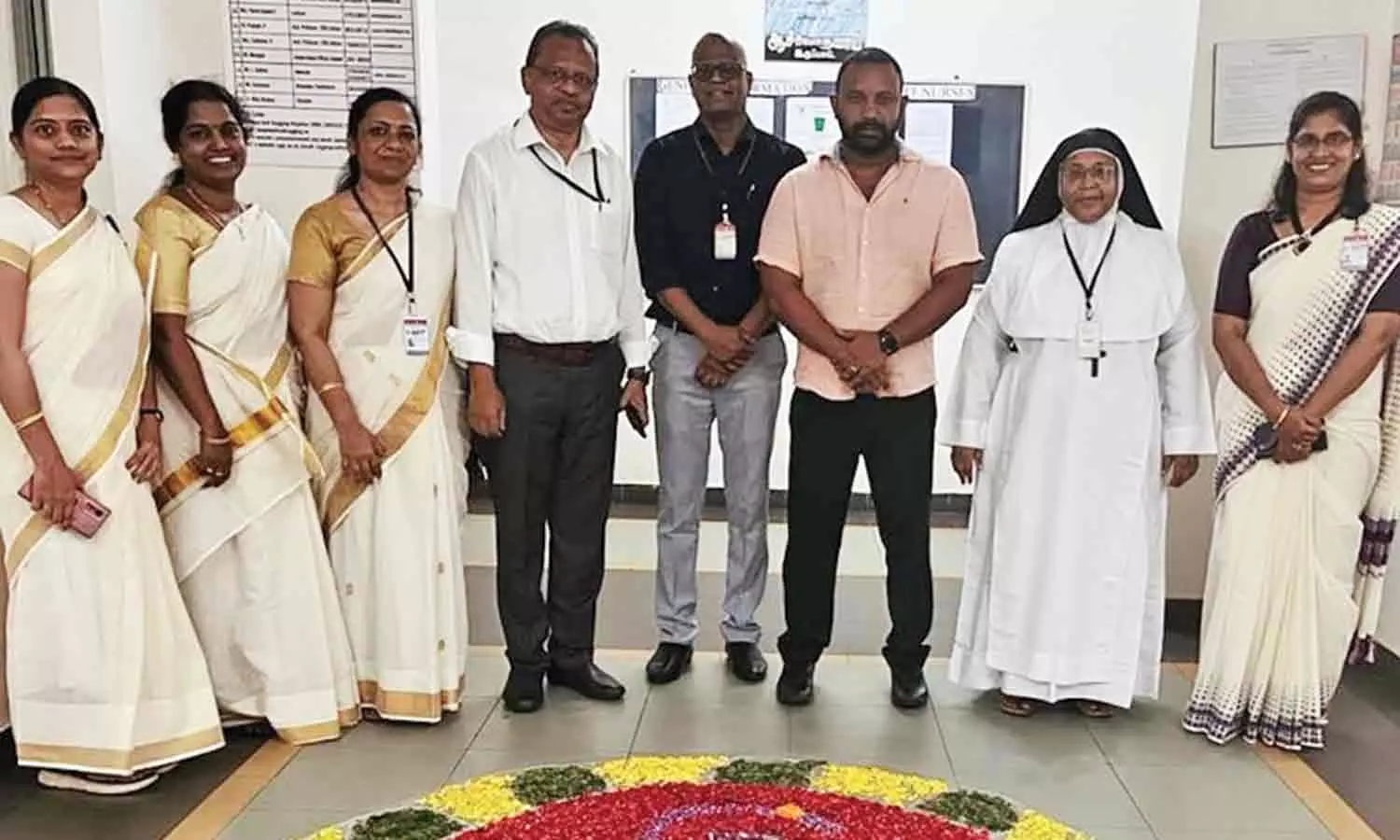 பிம்ஸ் மருத்துவமனையில் அத்தப்பூ கோலமிட்டு ஓணம் பண்டிகை கொண்டாடிய காட்சி.