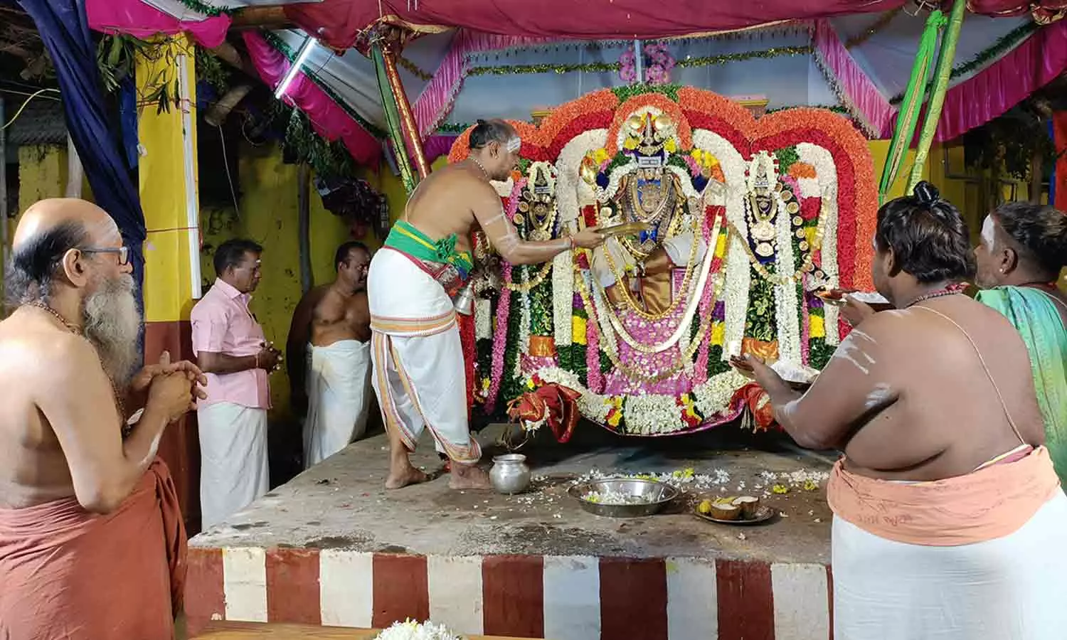 புதுவை மிஷன் வீதியில் உள்ள பொம்மபுர ஆதீன மடத்தில் நடந்த மயிலம் சுப்பிரமணியர் ஊஞ்சல் உற்சவத்தில் சன்னிதானம் சிவஞானபாலய சுவாமிகள் பங்கேற்ற காட்சி.