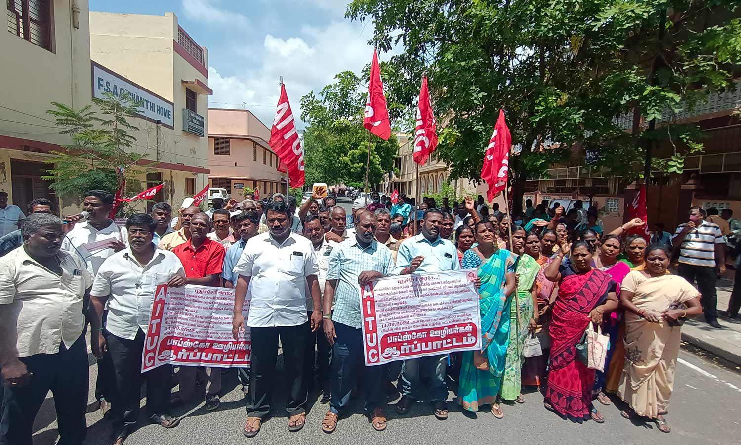 - ஏ.ஐ.டி.யூ.சி. மாநில செயல் தலைவர் அபிஷேகம், மாநில தலைவர் தினேஷ் பொன்னையா கண்டன உரையாற்றினர்.