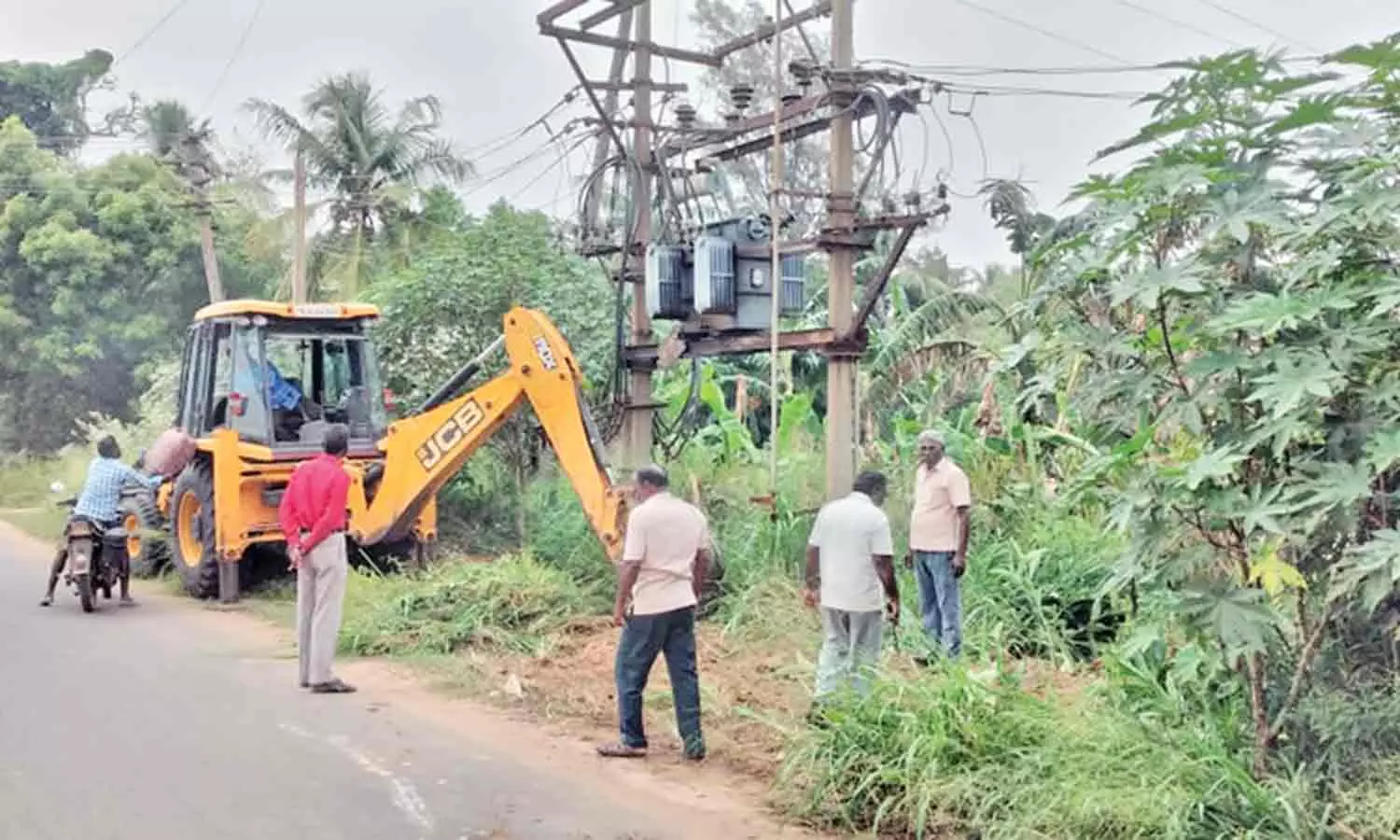 மின்சார டிரான்ஸ்பார்மரை சுற்றியுள்ள செடி, கொடிகளை மின் துறை ஊழியர்கள் பொக்லைன் எந்திரம் மூலம் அகற்றிய காட்சி.