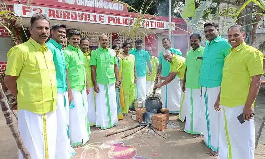 ஆரோவில் போலீஸ் நிலையத்தில் போலீசார் பொங்கல் கெண்டாடிய காட்சி.