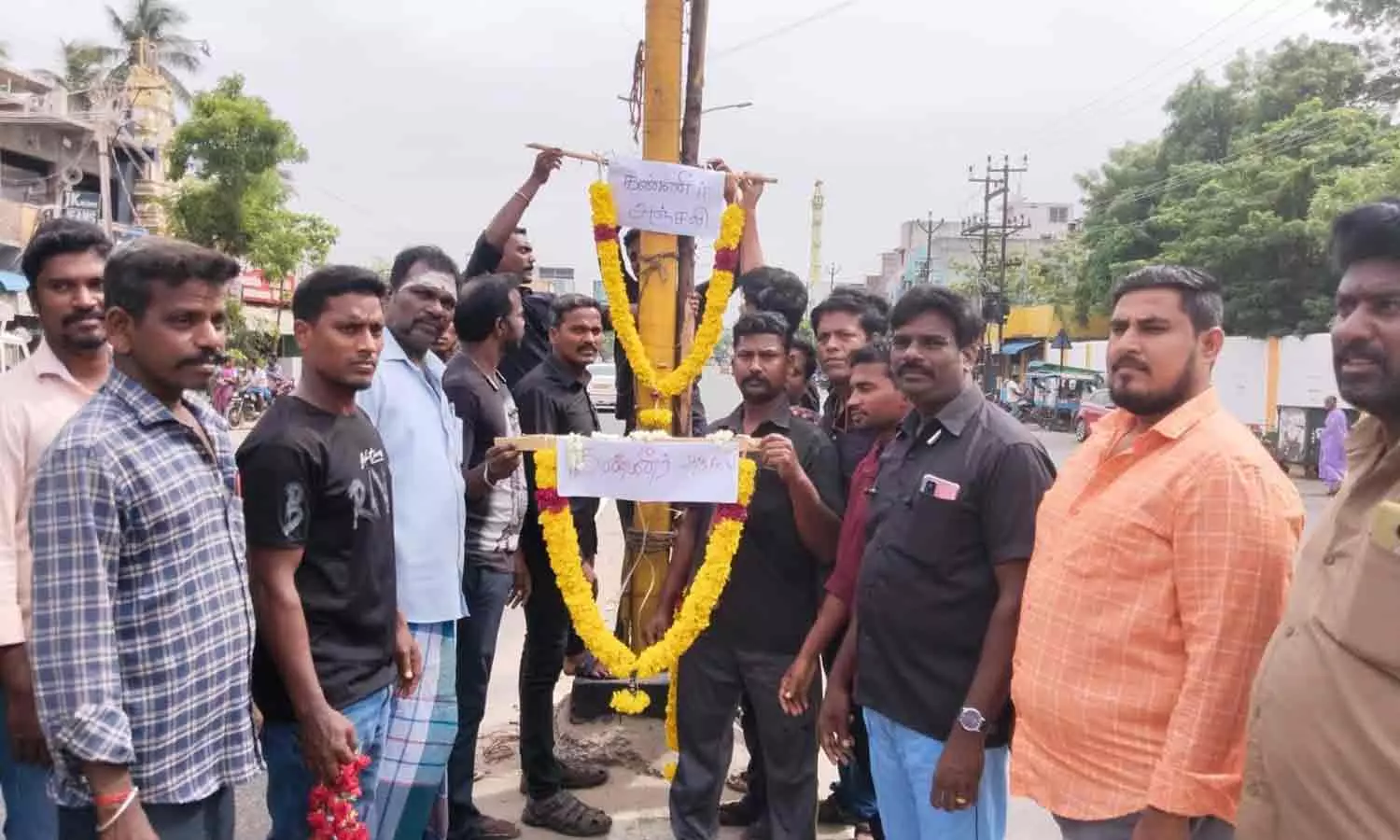 செயல்படாத தானியங்கி சிக்னல் கம்பத்துக்கு மாலை வைத்து அஞ்சலி செலுத்தி போராட்டம்