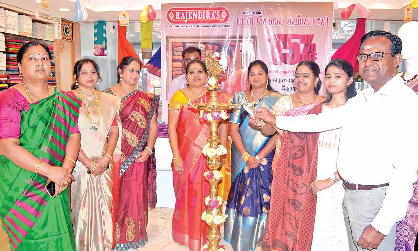 ராஜேந்திராஸ் ஜவுளிக்கடையில் பட்டு சேலை கண்காட்சியை கடை உரிமையாளர் ராஜேந்திரன் குத்து விளக்கேற்றி தொடங்கி வைத்தார்.