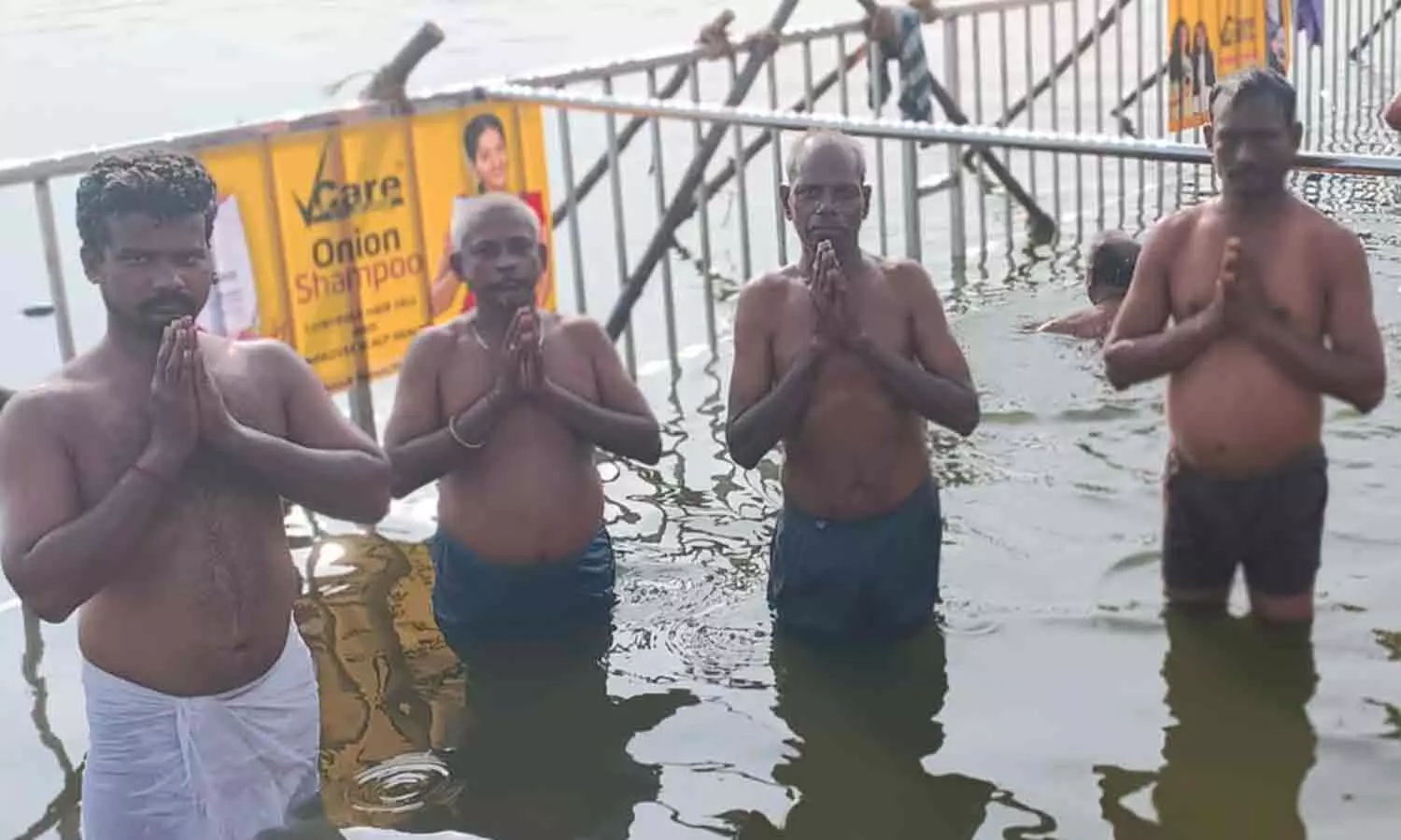 புஷ்கரணி நடைபெறும் சங்கராபரணி ஆற்றில் பக்தர்கள் நீராடி வணங்கிய காட்சி.